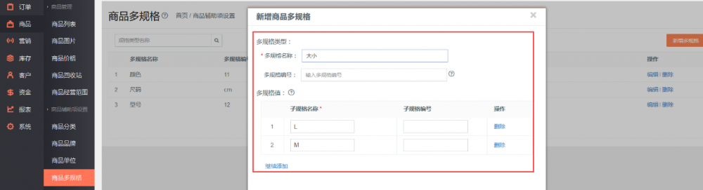 步骤2:【商品】-【商品多规格】-【新增/编辑多规格名称】-【多规格值】
