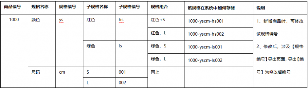 2.【子规格编号】和【多规格编号】,合并、组成商品详情中的规格编号。在【编辑商品】页,可【修改子编号】