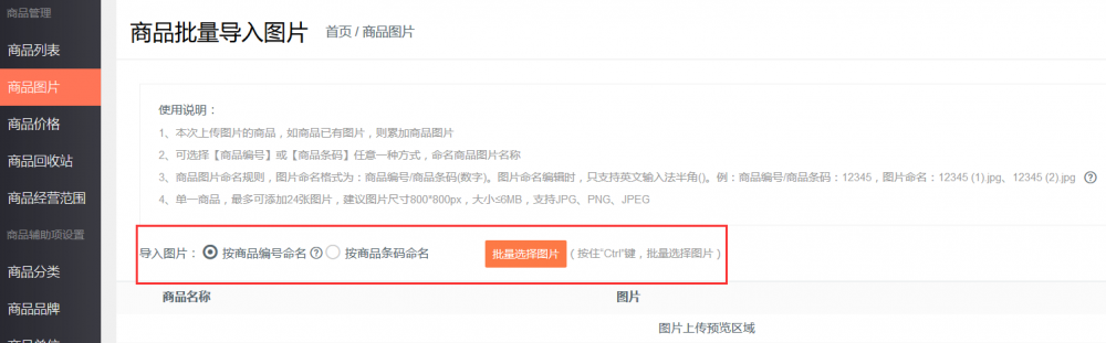 可通过【商品编号命名】/【商品条码命名】,图片名称,批量上传图片