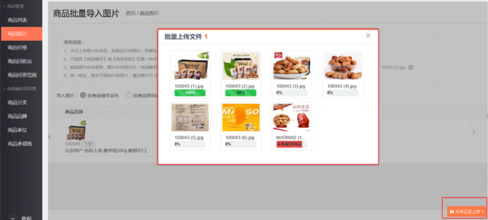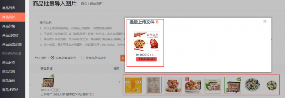 图片上传情况:【可匹配】的商品图片上传成功、预览效果;未匹配成功的图片,提醒:未匹配到商品(可不予处理)